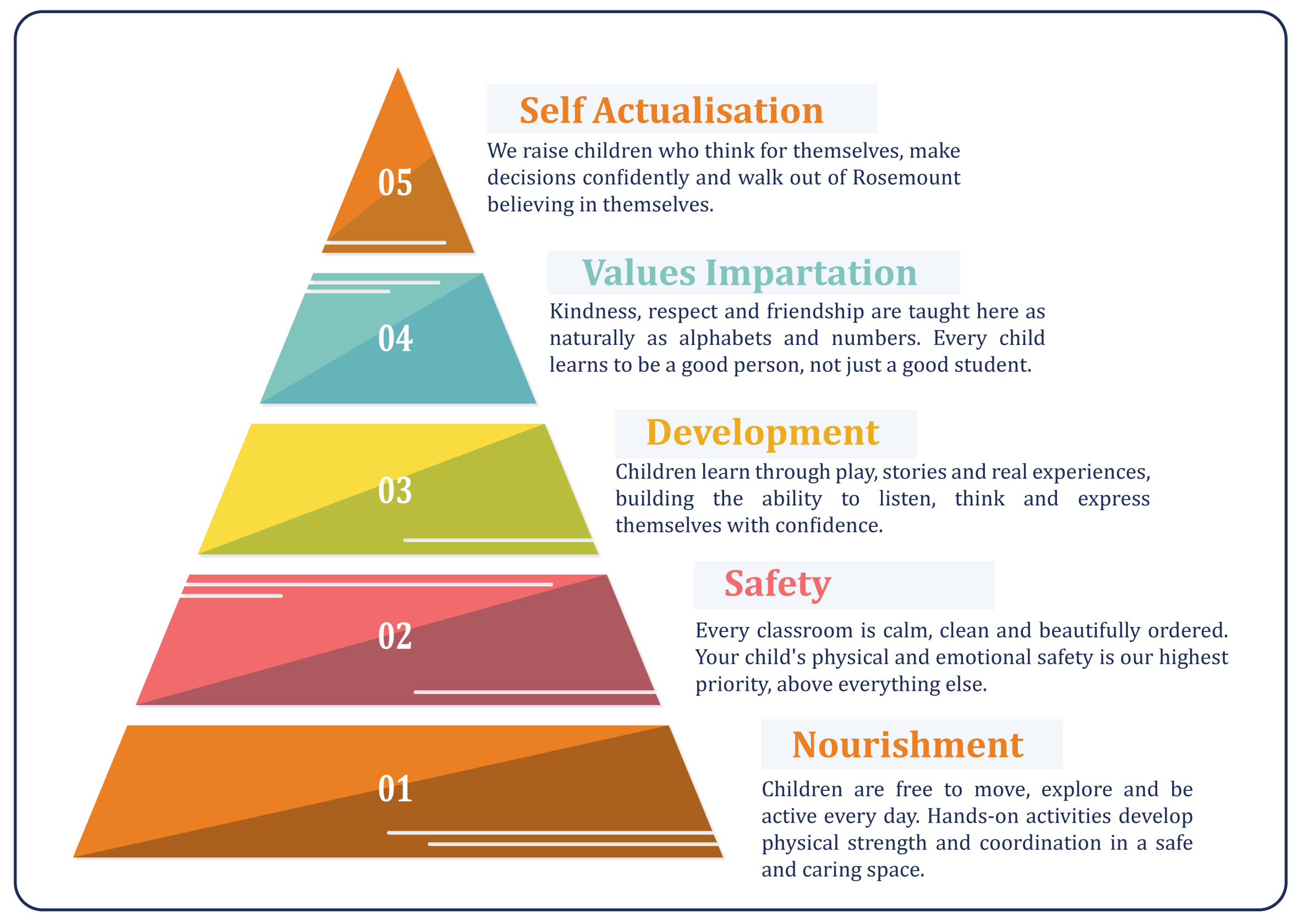 Developing integrity and strong values is fundamental to character formation. At Rosemount, children are guided to understand kindness, respect, responsibility, honesty and empathy through daily interactions and positive role modelling. These experiences help children make thoughtful choices and build a strong moral foundation from an early age.